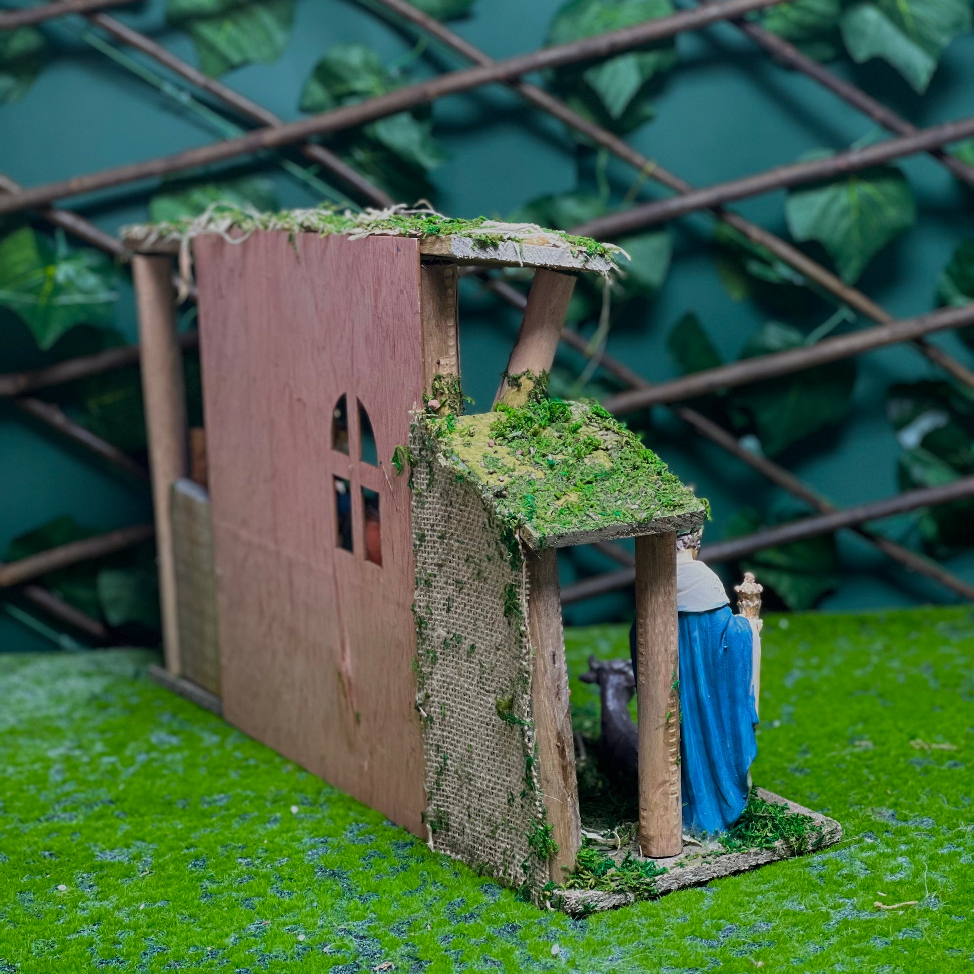 The wooden crib’s handcrafted roof, beams, and natural wood texture enhance the scene’s authenticity and charm.
