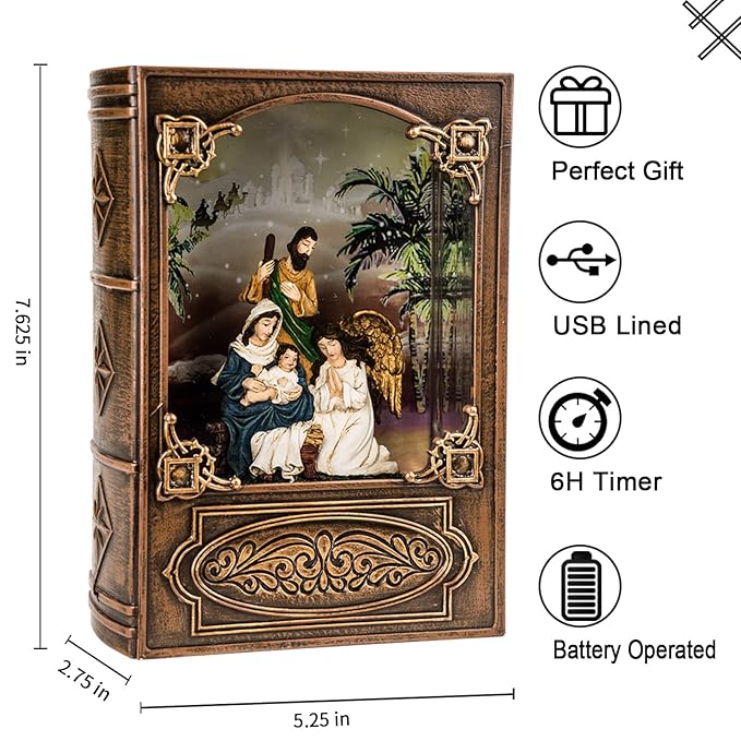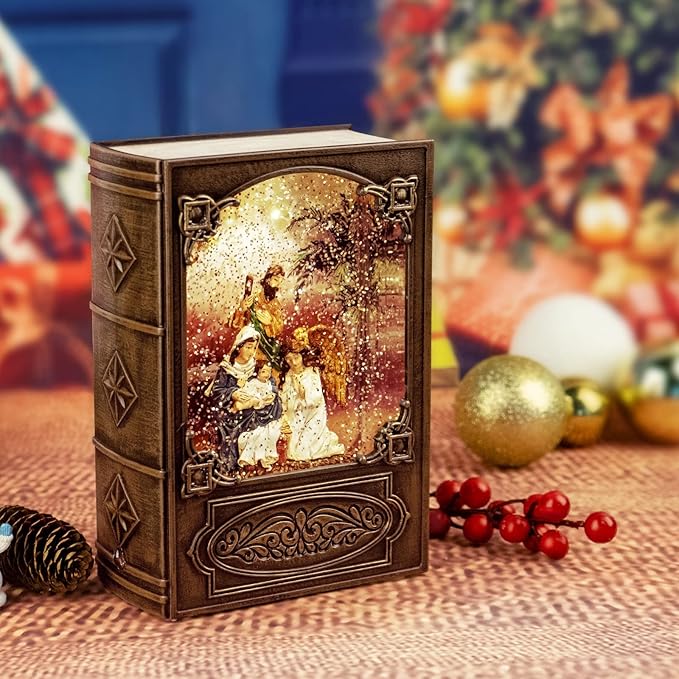 - Bible shaped Snow Globes: This particular snowball contains a nativity scene , Inside glitters and water swirling continuously when you turn on the lantern.Eight Christmas songs will be played on a loop